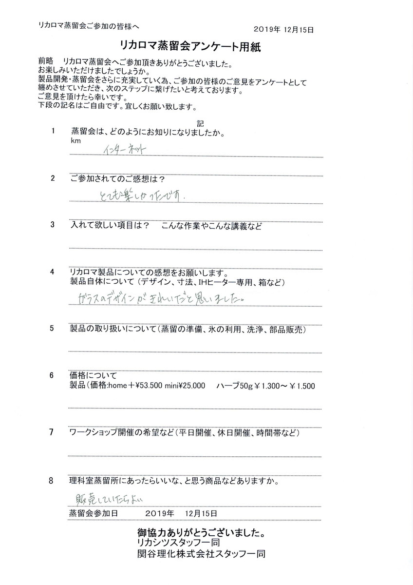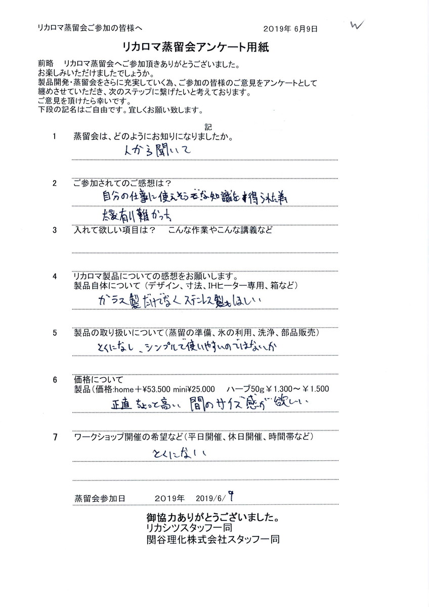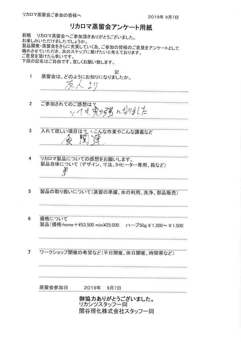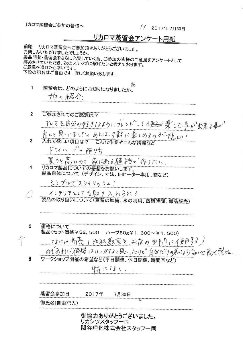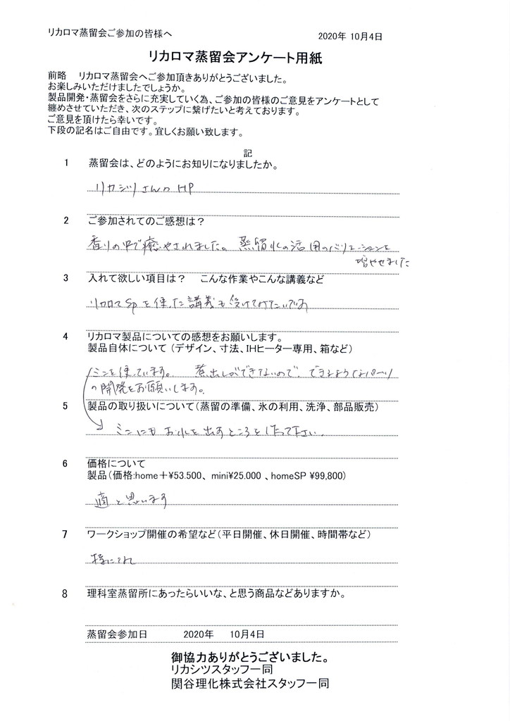 リカロマ蒸留会 ワークショップご体験者の感想を掲載しています。 リカロマ蒸留会 ワークショップのご予約は「リカシツ店舗」もしくは「リカロマ蒸留会 ワークショップ]詳細&ご予約HPにて、こちらから ※「予約サイト:RESERVA会員ログインしていただかないと 掲載内容が見れませんのでご注意ください」
