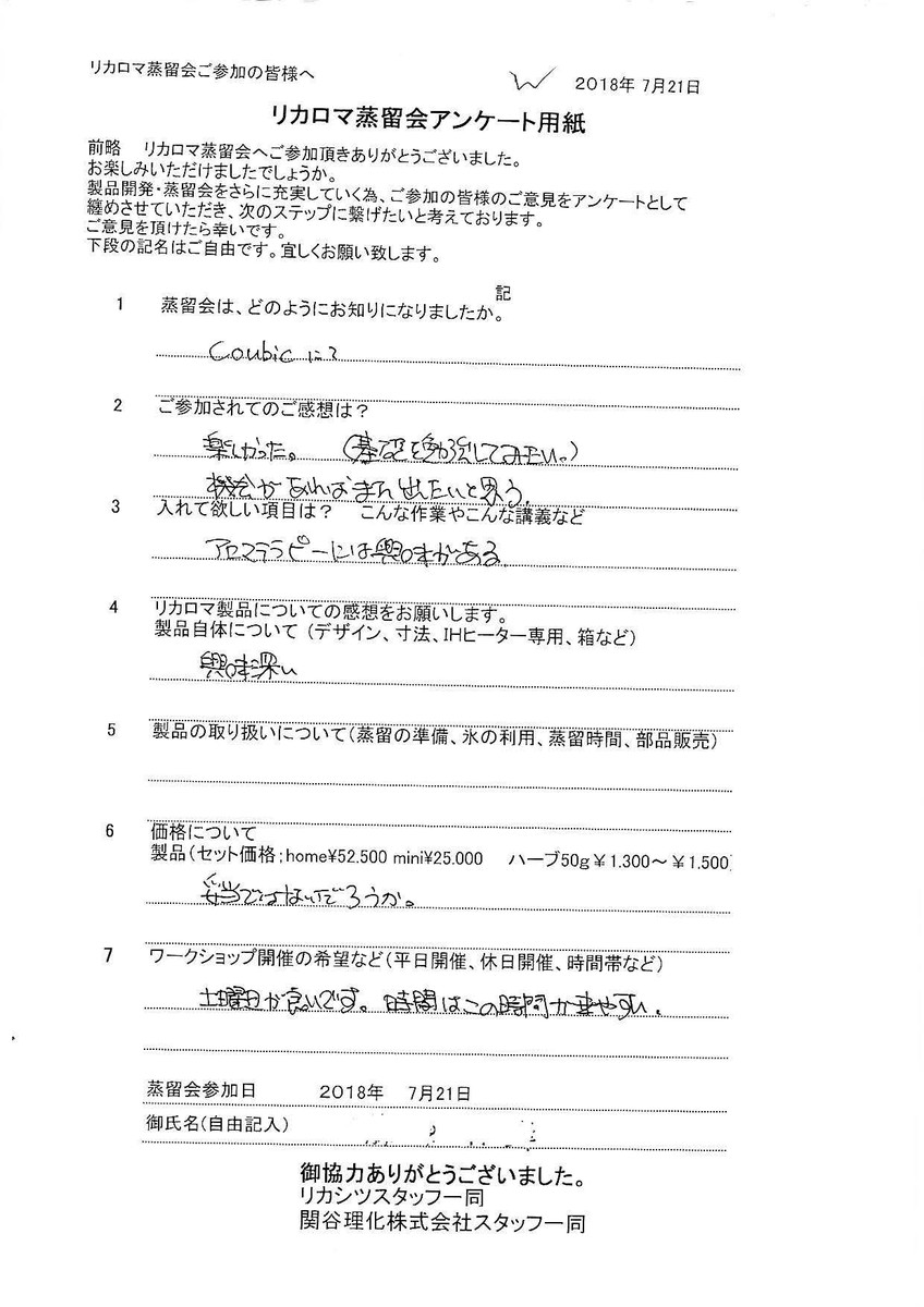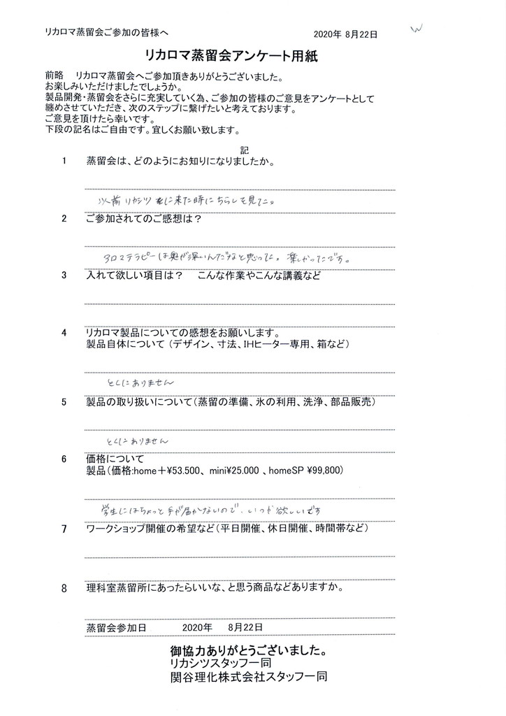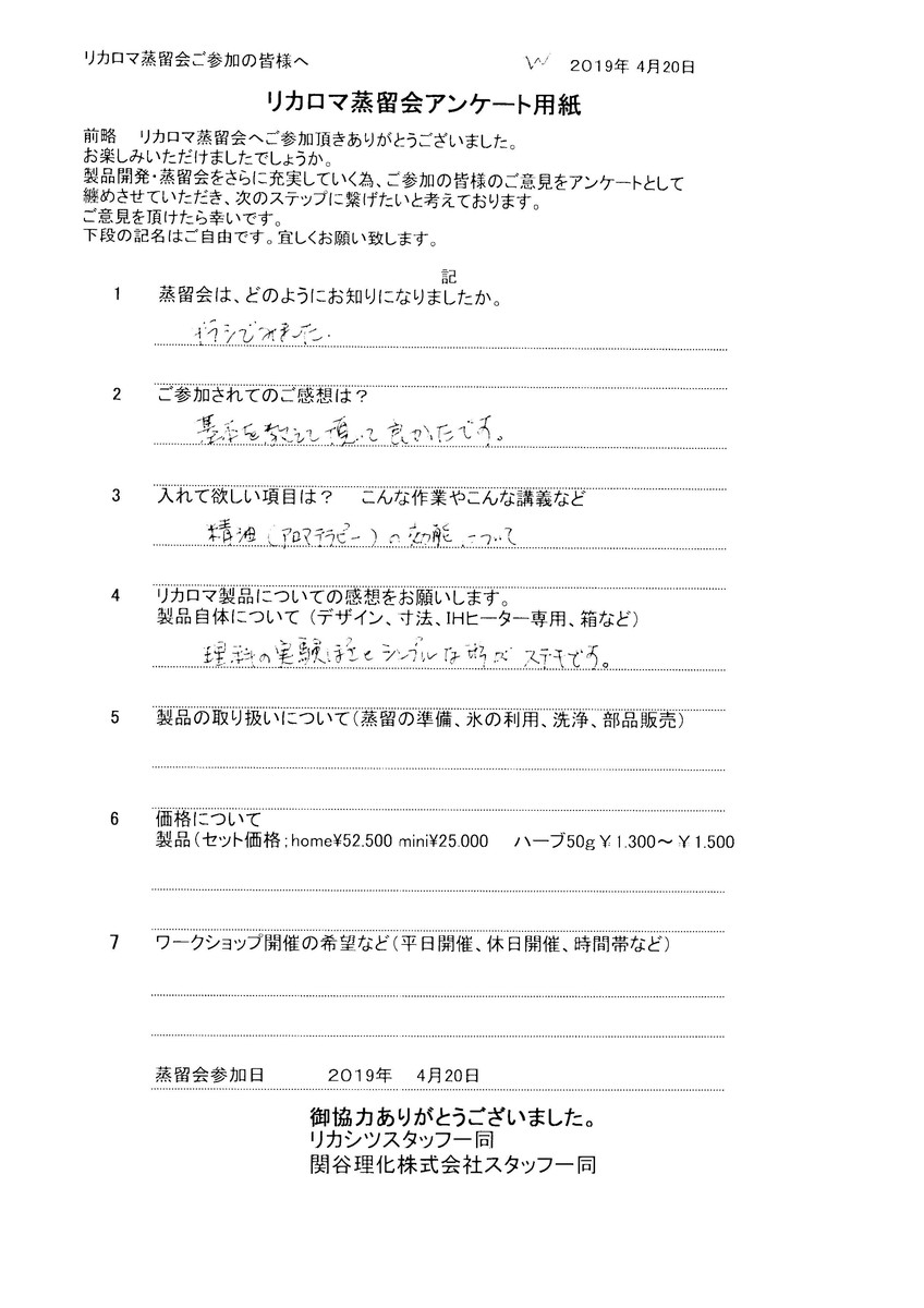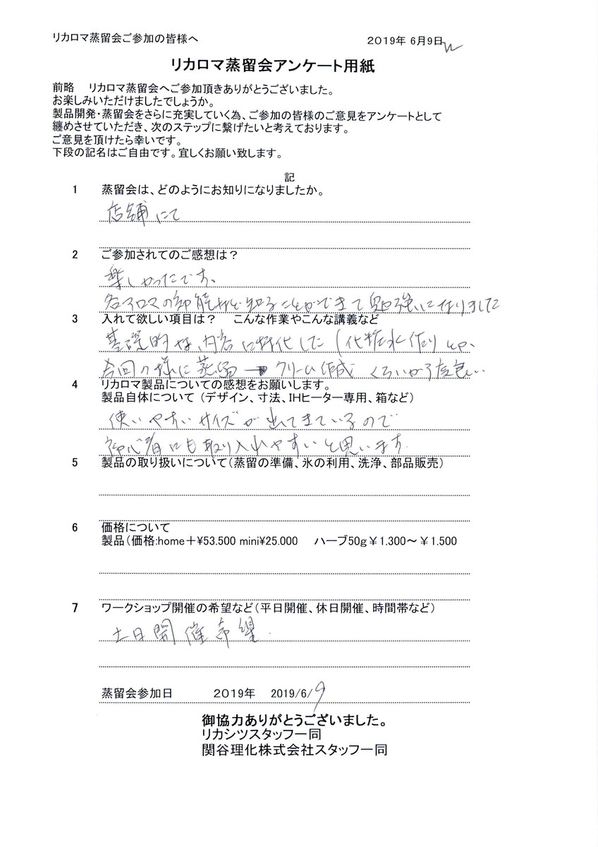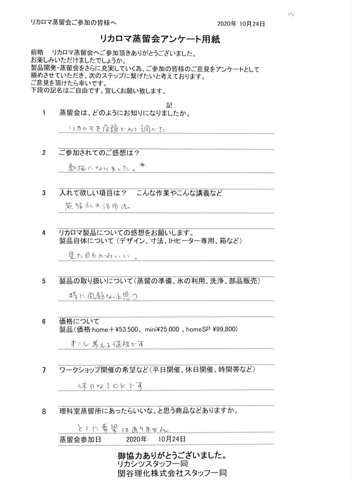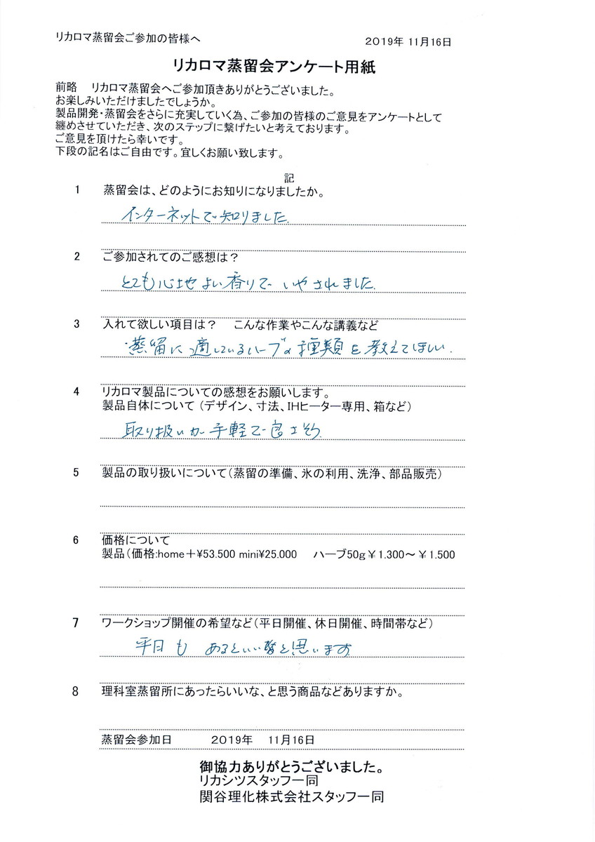 リカロマ蒸留会 ワークショップご体験者の感想を掲載しています。 リカロマ蒸留会 ワークショップのご予約は「リカシツ店舗」もしくは「リカロマ蒸留会 ワークショップ]詳細&ご予約HPにて、こちらから ※「予約サイト:RESERVA会員ログインしていただかないと 掲載内容が見れませんのでご注意ください」